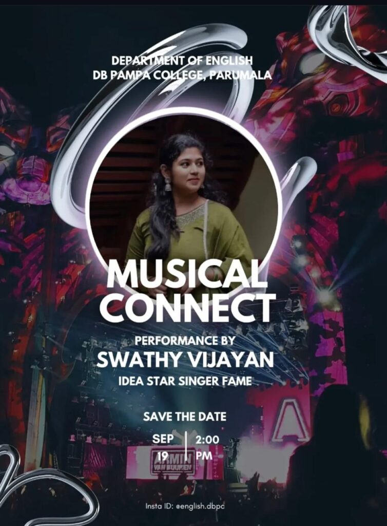 The Department of English at DB Pampa College, Parumala, organized an enchanting musical event titled “Musical Connect” on September 19, 2025, at the College Auditorium. The event featured a captivating live performance by Swathy Vijayan, Idea Star Singer fame, whose melodious renditions enthralled the audience.