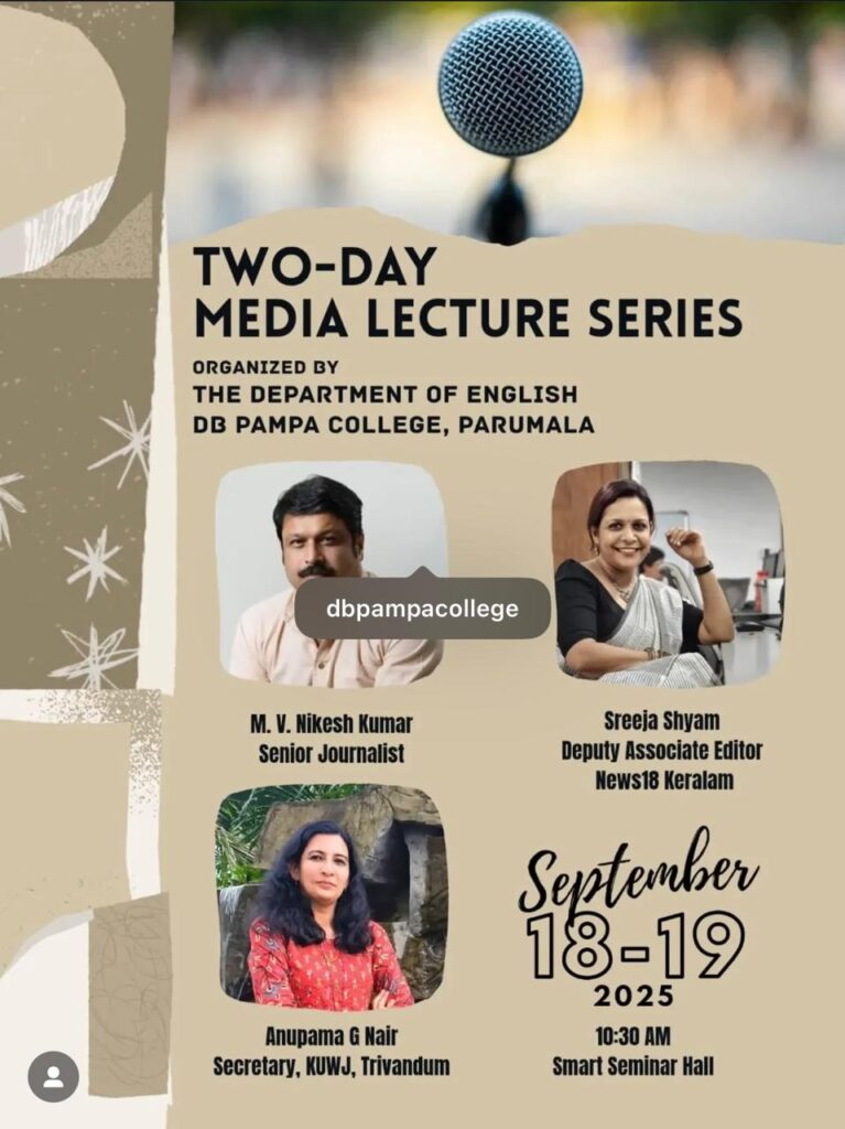 Two-Day Media Lecture Series 2025 The Department of English at DB Pampa College, Parumala, organized a Two-Day Media Lecture Series