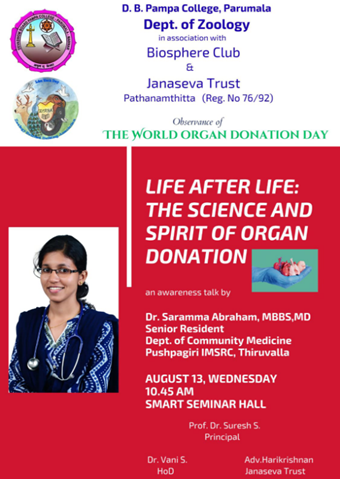 The Department of Zoology, D. B. Pampa College, Parumala, in association with the Biosphere Club and Janaseva Trust, Pathanamthitta, organized