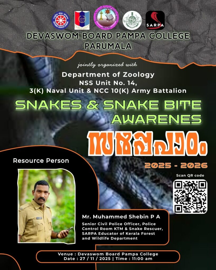 An awareness programme on “Snakes and Snake Bite” was organized at Devaswom Board Pampa College, Parumala on 27th September 2025